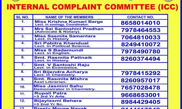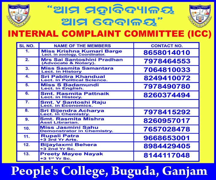 ସମ୍ପ୍ରତି ସାରା ରାଜ୍ୟରେ ଆଲୋଡନ ସୃଷ୍ଟି କରିଥିବା ଫକୀର ମୋହନ ସ୍ଵୟଂଶାସିତ ମହାବିଦ୍ୟାଳୟର ଛାତ୍ରୀ ସୌମ୍ଯାଶ୍ରୀ ବିଶିଙ୍କ ଆତ୍ମାହୁତି ଜନିତ ମୃତ୍ୟୁ ଘଟଣା ପରିପ୍ରେକ୍ଷୀରେ ବିଶ୍ବବିଦ୍ୟାଳୟ ଅନୁଦାନ ଆୟୋଗ (ୟୁଜିସି) ମାର୍ଗଦର୍ଶିକା ଅନୁଯାୟୀ ବୁଗୁଡା ପିପୁଲ୍ସ କଲେଜରେ ୧୩ ଜଣିଆ ଅଭ୍ଯନ୍ତରୀଣ ଅଭିଯୋଗ କମିଟି (ଆଇସିସି) ଗଠିତ ହୋଇଯାଇଛି। ରାଜ୍ୟ ସରକାରଙ୍କ ଉଚ୍ଚ ଶିକ୍ଷା ବିଭାଗର ପତ୍ର ସଂଖ୍ୟା – ୩୭୦୩୨,କଲେଜ ଅଧ୍ୟକ୍ଷ ଡଃ ପୁରୁଷୋତ୍ତମ ମିଶ୍ରଙ୍କ ପ୍ରତ୍ଯକ୍ଷ ତତ୍ତ୍ବାବଧାନରେ ଗଠିତ ଉକ୍ତ କମିଟିରେ ସଂଯୋଜିକା ଭାବେ ପ୍ରାଣୀ ବିଜ୍ଞାନ ବିଭାଗର ଅଧ୍ୟାପିକା କ୍ରିଷ୍ଣା କୁମାରୀ ବାର୍ଗୀ, ଅଧିବକ୍ତା ସାଈ ସନ୍ତୋଷିନୀ ପ୍ରଧାନ,ଇତିହାସ ବିଭାଗ ଅଧ୍ୟାପିକା ସସ୍ମିତା ସାମନ୍ତରା, ରାଜନୀତି ବିଜ୍ଞାନ ଅଧ୍ୟାପକ ପବିତ୍ର ଖଣ୍ଡୁଆଳ ,ଇଂରାଜୀ ବିଭାଗର ଅଧ୍ୟାପିକା ଏସ୍ ବଡମୁଣ୍ଡି ,ରସାୟନ ବିଜ୍ଞାନ ଅଧ୍ଯାପକ ବିଜେନ୍ଦ୍ର ଆଚାର୍ଯ୍ୟ, ଇତିହାସ ଅଧ୍ୟାପିକା ରଶ୍ମିତା ପଟ୍ଟନାୟକ , ଅର୍ଥନୀତି ବିଭାଗର ଅଧ୍ୟାପିକା ଭି ସନ୍ତୋଷୀ ରାଜୁ, ରସାୟନ ବିଜ୍ଞାନ ବିଭାଗୀୟ ଡେମୋନଷ୍ଟେଟର୍ ଯସ୍ମିନ ସାହୁ, ଆସିଷ୍ଟାଣ୍ଟ ଲାଇବ୍ରେରିଆନ୍ ରଶ୍ମିତା ମିଶ୍ରଙ୍କ ସମେତ +୩ କଳା ତୃତୀୟ ବର୍ଷ ଛାତ୍ରୀ ରୂପାଲି ପାତ୍ର , ଦ୍ବିତୀୟ ବର୍ଷ ବିଜ୍ଞାନ ଛାତ୍ରୀ ବିଜୟଲକ୍ଷ୍ମୀ ବେହେରା ଓ ପ୍ରଥମ ବର୍ଷ ବିଜ୍ଞାନ ଛାତ୍ରୀ ପ୍ରୀତିମୟୀ ନାୟକ ପ୍ରମୁଖ ରହିଥିବା ଜଣାଯାଇଛି।