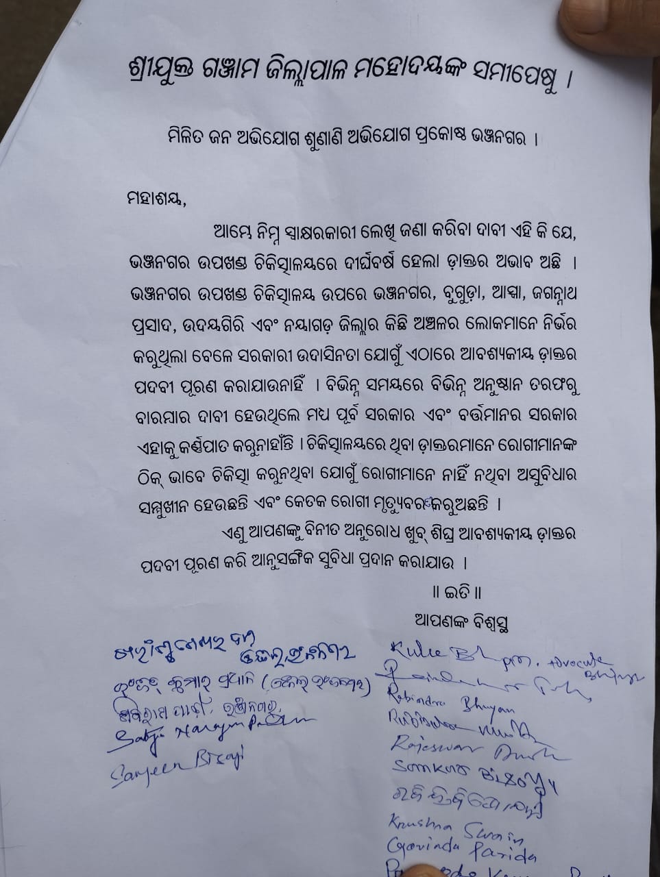 ଦେଖିବାକୁ ମିଳେ ବହୁତ ସାମୁହିକ ସମସ୍ୟା ସହ ବ୍ୟକ୍ତିଗତ ସମସ୍ୟା ସେଭିତରେ ସଦାସର୍ବଦା ସ୍ଥାନୀୟ ଉପଖଣ୍ଡର ସ୍ୱାସ୍ଥ୍ୟ ସମସ୍ୟା କାହିଁ ମାନ୍ଧତା କାଳରୁ ଏପର୍ଯ୍ୟନ୍ତ ହୋଇପାରିଲା ନାହିଁ କୌଣସି ସରକାର ତରଫରୁ ମେଡିକାଲର ସବୁ ବିଭାଗ ର ଡାକ୍ତର ସମସ୍ୟା. ପୁଣିଥରେ ସେହିସମସ୍ୟା କୁ ଉପସ୍ଥାପନ କରିଛନ୍ତି ସ୍ଥାନୀୟ ଯୁବ କଂଗ୍ରେସ କର୍ମୀ କୁଲୁଭୂୟା ସମର୍ଥକ ମାନେ, ସ୍ଥାନୀୟ ବରିଷ୍ଟ ଓକିଲ ଶ୍ରୀଯୁକ୍ତ ଖରାଂଶୁଶେଖର ଦାସ ଙ୍କ ଉପସ୍ଥିତ ରେ ସମସ୍ତ ସାମ୍ବାଦିକ ଙ୍କ ଗହଣ ରେ ସ୍ଥାନୀୟ SDMO ଙ୍କ ସମୁଖରେ ଦାବିପତ୍ର ପ୍ରଦାନ l