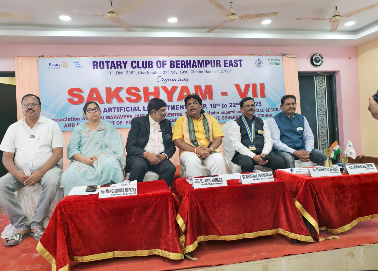 ମୁଖ୍ୟ ଅତିଥି ରୂପେ ଚିକିଟିର ମାନ୍ୟବର ବିଧାୟକ ମନୋରଞ୍ଜନ ଡ୍ୟାନ୍ସାମନ୍ତରାୟ ଯୋଗ ଦେଇ ଆସ୍ତି ବାଚକ ଚିନ୍ତାଧାରା ନେଇ ସାମାଜିକ ସ୍ତରରେ ଅବହେଳିତ ହୋଇ ରହିଯାଉଥିବା ଜନସାଧାରଣଙ୍କୁ ସାହାଯ୍ୟର ହାତ ବଢ଼ାଇ ଯଶସ୍ବୀ ହେବା ଏବଂ ବିକଶିତ ଭାରତର ସ୍ବପନକୁ ସାର୍ଥକ କରିବା ପାଇଁ ଆହ୍ୱାନ ଦେଇଥିଲେ l ରୋଟାରୀ କ୍ଲଵ ସଭ୍ୟମାନେ ଯେଉଁ ସବୁ ଜନହିତକର କାର୍ଯ୍ୟ କରୁଛନ୍ତି ତାହା ପ୍ରଶଂସା ଯୋଗ୍ୟ ବୋଲି ମତ ପ୍ରକାଶ କରିଥିଲେ l ବ୍ରହ୍ଣପୁର ମାନ୍ୟବର ବିଧାୟକ ଏ. ଅନିଲ କୁମାର ଯୋଗ ଦେଇ କ୍ଲଵର କାର୍ଯ୍ୟକ୍ରମକୁ ପ୍ରଶଂସା କରିଥିଲେ l କ୍ଳବର ସଭାପତି ଡ଼ଃ ପ୍ରଦୀପ୍ତ କୁମାର ପଟନାୟକଙ୍କ ପୌରହିତ୍ୟରେ ଆୟୋଜିତ ଏହି କାର୍ଯ୍ୟକ୍ରମରେ ରୋଟାରୀ ଜିଲ୍ଲା 3262 ର ଭିନ୍ନକ୍ଷମ ବିଭାଗ ଚେୟାରମ୍ୟାନ ଅଜିତ କୁମାର ପୃଷ୍ଟି ବିବରଣୀ ପ୍ରଦାନ କରି ରୋଟାରୀ ଇଷ୍ଟ ଆନୁକୂଲ୍ୟରେ ନୟାଗଡ, ସୁନ୍ଦରଗଡ଼, ବ୍ରହ୍ମପୁର ଠାରେ କୃତ୍ରିମ ଅଙ୍ଗ ପ୍ରତିରୋପଣ ଶିବିର ଆୟୋଜିତ ହୋଇଛି l ବ୍ରହ୍ମପୁର ଠାରେ 5 ଦିନ ଧରି ଚାଲିବାକୁ ଥିବା ଶିବିରରେ 250 ଜଣ ଦିବ୍ୟାଙ୍ଗ ପଞ୍ଜିକରଣ କରଣ କରିଛନ୍ତି l ଆଗାମୀ 24ରୁ 28 ପର୍ଯ୍ୟନ୍ତ ପାରଳାଖେମୁଣ୍ଡି ଠାରେ ମଧ୍ୟ ଶିବିର ଆୟୋଜନ ହେବ ବୋଲି ପ୍ରକାଶ କରିଥିଲେ l ସହ ପ୍ରାନ୍ତପାଳ ଝରଣା ପଣ୍ଡା, କ୍ଳବର ପ୍ରୋଜେକ୍ଟ ଚେୟାରମ୍ୟାନ ନାରସୁଜେନା ଉଦବୋଧନ ଦେଇଥିଲେ l କ୍ଳବର ନିର୍ବାଚିତ ସଭାପତି ହୃଷିକେଶ ପ୍ରଧାନ ସଭା ସଂଯୋଜନା କରିଥିବା ବେଳେ ସମ୍ପାଦକ ଅଶ୍ୱିନୀ କୁମାର ପାତ୍ର ଧନ୍ୟବାଦ ଅର୍ପଣ କରିଥିଲେ l କ୍ଳବର ପୂର୍ଵତନ ସଭାପତି ବୃନ୍ଦ ଏବଂ ସଭ୍ୟ ସମସ୍ତ କାର୍ଯ୍ୟକ୍ରମ ପରିଚାଳନା କରିଥିଲେ l ପ୍ରଥମ ଦିନରେ 110 ଜଣଙ୍କୁ ବିଭିନ୍ନ କୃତ୍ରିମ ଅଙ୍ଗ ପ୍ରଦାନ କରାଯାଇଥିଲା l