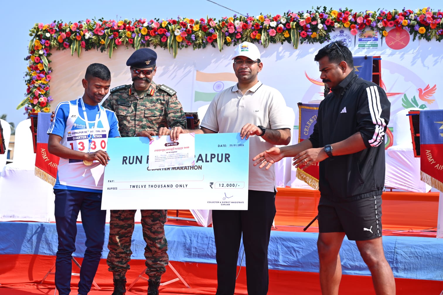 ପୁରୁଷ ବିଭାଗରେ ଓଡ଼ିଶା ପୋଲିସ ୮ ଆର ବି, ଭଞ୍ଜନଗରରେ କାର୍ଯ୍ୟରତ ଅଶୋକ ଦଣ୍ଡସେନା ପ୍ରଥମ ସ୍ଥାନ, କଟକ ଜିଲ୍ଲାର ରଶ୍ମୀ ରଞ୍ଜନ ନାୟକ ଦ୍ବିତୀୟ ସ୍ଥାନ ଓ ଗଜପତି ଜିଲ୍ଲାର ଗୀନୁ ରଇତ ତୃତୀୟ ସ୍ଥାନ ଅଧିକାର କରିଥିଲେ । ସେହିପରି ମହିଳା ବର୍ଗରେ ଭୁବନେଶ୍ବରର ପିଙ୍କି ସାହୁ ପ୍ରଥମ, ବ୍ରହ୍ମପୁର ଫିଜିକାଲ ଏକାଡ଼େମୀର ସନ୍ଧ୍ୟାରାଣୀ ବେହେରା ଓ ରାଧାରାଣୀ ବେହେରା ଯଥାକ୍ରମେ ଦ୍ବିତୀୟ ଓ ତୃତୀୟ ସ୍ଥାନ ଅଧିକାର କରିଥିଲେ । ଗୋପାଳପୁର ମୁଖ୍ୟ ବେଳାଭୂମିଠାରେ ଆୟୋଜିତ ଏକ ଭବ୍ୟ ସମାରୋହରେ ଜିଲ୍ଲାପାଳ ଶ୍ରୀ ୱ।ସନ, ଗଞ୍ଜାମ ଆରକ୍ଷୀ ଅଧିକ୍ଷକ ଶ୍ରୀ ପାତ୍ର ଓ ଗୋପାଳପୁର ଆର୍ମୀ ଏଡି କଲେଜର ବରିଷ୍ଠ ଅଧିକାରୀମାନେ ସମସ୍ତ ଧାବକଙ୍କୁ ଅଭିନନ୍ଦନ ଜଣାଇବା ସହ କୃତୀ ପ୍ରତିଯୋଗୀମାନଙ୍କୁ ଯଥାକ୍ରମେ ପ୍ରଥମ ୧୨,୦୦୦/-,ଦ୍ବିତୀୟ ୮,୦୦୦ /- ଏବଂ ତୃତୀୟ ୫୦୦୦ /- ଟଙ୍କା ର ପୁରସ୍କାର ରାଶି ଓ ମାନପତ୍ର ପ୍ରଦାନ କରିଥିଲେ । ଏହି ଅବସରରେ ଗୋପାଳପୁର ଆର୍ମୀ ଏଡି କଲେଜ ପକ୍ଷରୁ ମନୋଜ୍ଞ ଦେଶାତ୍ମବୋଧକ ସଙ୍ଗୀତ ପରିବେଷଣ କରାଯାଇଥିଲା । ଡୁରା ଜଙ୍ଗସନଠାରୁ ଆରମ୍ଭ ହୋଇଥିବା ଏହି ମାରାଥନରେ ପାଖାପାଖି ୬୭୦ ଜଣ ପ୍ରତିଯୋଗୀ ଅଂଶ ଗ୍ରହଣ କରିଥିଲେ । ଅଞ୍ଚଳବାସୀ ରାସ୍ତାର ଉଭୟ ପାର୍ଶ୍ବରେ ଠିଆ ହୋଇ ପ୍ରତିଯୋଗୀ ମାନଙ୍କୁ ଉତ୍ସାହିତ କରିଥିଲେ ।ଜିଲ୍ଲା ସୂଚନା ଓ ଲୋକସମ୍ପର୍କ ଅଧିକାରୀ ଗଞ୍ଜାମ, ଛତ୍ରପୁର