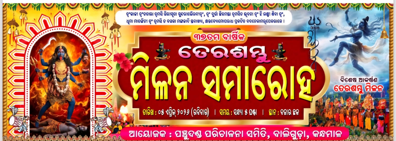 ବାଲିଗୁଡା ସହରରେ ପ୍ରତିବର୍ଷ ଭଳି ଏବର୍ଷ ମଧ୍ୟ ମା’ କାଳୀଙ୍କ ପବିତ୍ର ଦଣ୍ଡଯାତ୍ରା ଅବସରରେ ୩୭ତମ ବାର୍ଷିକ ତେର ଶମ୍ଭୁ ମିଳନ ସମାରୋହ ଆସନ୍ତା ଏପ୍ରିଲ ୫ ତାରିଖ ରବିବାର ଦିନ ଆୟୋଜିତ ହେବ। ଏହାକୁ ନେଇ ସ୍ଥାନୀୟ ପଞ୍ଚୁଦଣ୍ଡ ପରିଚାଳନା ସମିତି ପକ୍ଷରୁ ସମସ୍ତ ପ୍ରସ୍ତୁତି ଶେଷ ପର୍ଯ୍ୟାୟକୁ ପହଞ୍ଚିଛି।ଏହି ପରିପ୍ରେକ୍ଷୀରେ ଏପ୍ରିଲ ୧ ଠାରୁ ୧୪ ତାରିଖ ପର୍ଯ୍ୟନ୍ତ ଚାଲିବାକୁଥିବା ୧୩ ଦିନିଆ ଦଣ୍ଡଯାତ୍ରା ସମୟରେ ସହରରେ ଅଣ୍ଡା, ମାଛ, ମାଂସ, ଶୁଖୁଆ ଭଳି ସମସ୍ତ ଆମିଷ ଖାଦ୍ୟର ବିକ୍ରି ଓ ସେବନ ପୂର୍ଣ୍ଣରୂପେ ବନ୍ଦ ରହିବ। ଏହି ନିଷ୍ପତ୍ତିକୁ ସମର୍ଥନ କରି ସମସ୍ତ ନାଗରିକଙ୍କୁ ସହଯୋଗ କରିବା ପାଇଁ ସମିତି ପକ୍ଷରୁ ଅନୁରୋଧ କରାଯାଇଛି।କାର୍ଯ୍ୟସୂଚୀ ଅନୁଯାୟୀ, ଏପ୍ରିଲ ୫ ସକାଳ ୮ଟାରେ ମା’ ପାଟ୍ଟଖଣ୍ଡା ମନ୍ଦିରରେ ୧୩ ଦଣ୍ଡ ଥଳର ବରଣ କରାଯିବ। ପରେ ଦିବା ୧୧ଟା ୩୦ ମିନିଟରେ ମେନ୍ ରୋଡ଼ରେ ଧୂଳିଦଣ୍ଡ ଅନୁଷ୍ଠିତ ହେବ। ଅପରାହ୍ନ ୪ଟା ୩୦ ମିନିଟରେ ବନ୍ଧପାଖରେ ପାଣିଦଣ୍ଡ ଆୟୋଜନ ହେବ।ସନ୍ଧ୍ୟା ୫ଟାରେ ବଜାର ଛକ ନିକଟରେ ଅଞ୍ଚଳର ସବୁଠାରୁ ଆକର୍ଷଣୀୟ ୧୩ ଦଣ୍ଡର ମହାମିଳନ ଭବ୍ୟ ଭାବେ ଆୟୋଜିତ ହେବ। ଏହା ପରେ ରାତ୍ରି ୮ଟାରୁ ୧୨ଟା ପର୍ଯ୍ୟନ୍ତ ବିଭିନ୍ନ ସାଂସ୍କୃତିକ କାର୍ଯ୍ୟକ୍ରମ ଚାଲିବ। ରାତ୍ରି ୧୧ଟାରେ ଝୁଣାଦଣ୍ଡର ବିରାଟ ପଟୁଆର ଏହି ଉତ୍ସବକୁ ଅଧିକ ଆକର୍ଷଣୀୟ କରିଦେବ।ଏହି ଦଣ୍ଡଯାତ୍ରା ଏପ୍ରିଲ ୬ ସକାଳ ୮ଟାରେ ସମାପ୍ତ ହେବ। ଏହି ପବିତ୍ର ଅବସରରେ ବହୁ ସଂଖ୍ୟାରେ ଭକ୍ତ ଓ ସାଧାରଣ ଲୋକଙ୍କୁ ଯୋଗଦେବାକୁ ସମିତି ପକ୍ଷରୁ ଆହ୍ୱାନ ଜଣାଯାଇଛି।