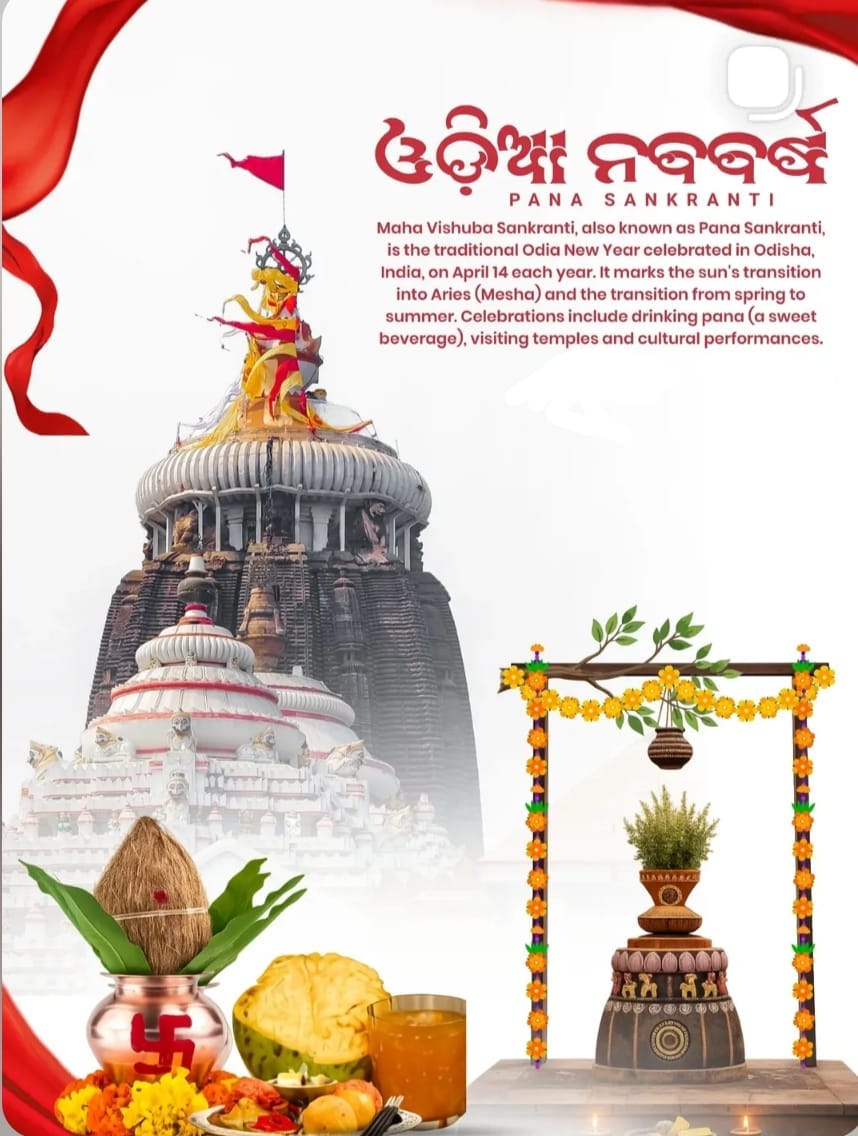 ପବିତ୍ର ଓଡ଼ିଆ ନବବର୍ଷ ତଥା ମହାବିଷୁବ ସଂକ୍ରାନ୍ତି ପଣା ସଂକ୍ରାନ୍ତି ଏହି ନୂତନ ବର୍ଷ ସମସ୍ତଙ୍କ ଜୀବନରେ ସୁଖ, ସମୃଦ୍ଧି ଓ ନିରାମୟ ଆଣିଦେଉ। ଘରେ ଘରେ ପଣା ଭୋଗ ସହ ନୂଆ ପାଞ୍ଜି ପୂଜା ପୂର୍ବକ ଏହି ପାରମ୍ପରିକ ଦିନଟିକୁ ଆନନ୍ଦରେ ପାଳନ କରନ୍ତୁ।